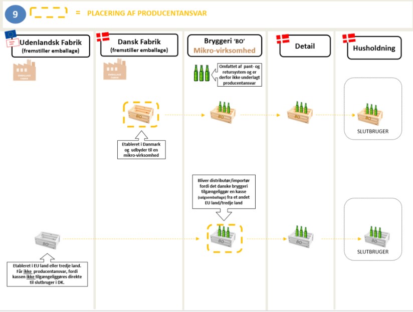 Mikrovirksomheden kan kun får producentansvaret for emballagen hvis de importerer et product til det danske marked. Se illustration 2. Hvis mikrovirksomheden derimod køber emballagen i Danmark, vil det være fabrikanten der har ansvaret, uanset om det er med private label eller varemærke.
