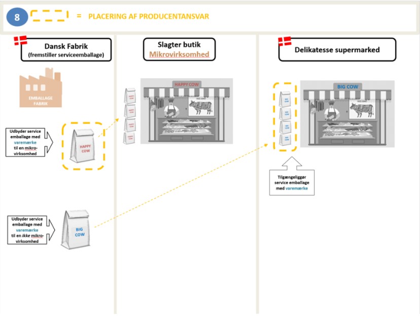 Mikrovirksomheden køber emballage af en dansk fabrik, her vil den danske fabrikant af emballagen have producentansvaret uanset private label, eftersom det er salg til en mikrovirksomhed. Hvis den danske fabrikant sælger med private label til en anden virksomhed som ikke er pr. definition en mikrovirksomhed, så vil den anden virksomhed som tilgængeligere emballagen have producentansvaret.